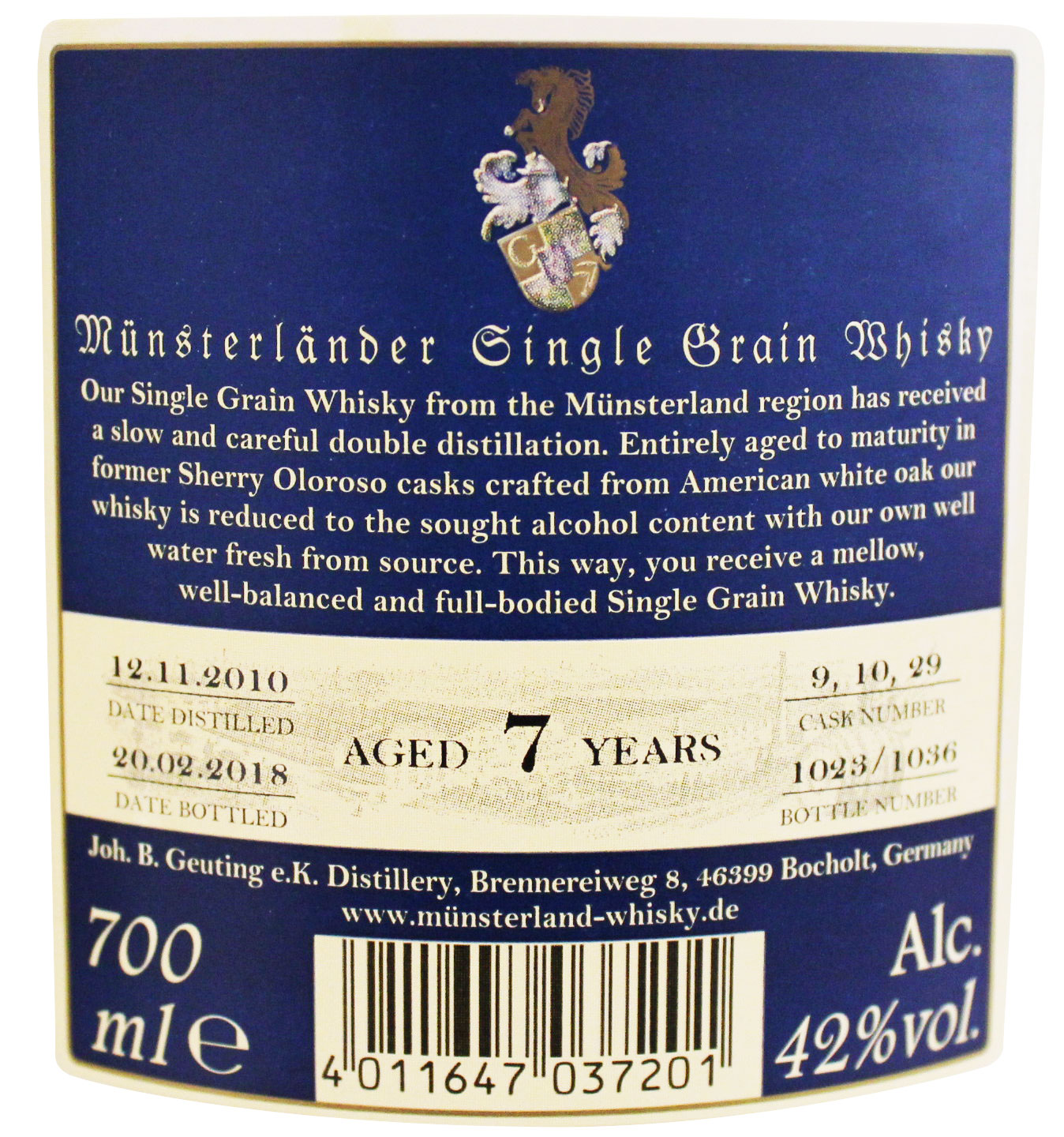 Produktinformationen "J.B.G Münsterländer Single Grain Whisky, 7 Jahre, Sherry Oloroso cask, 42%vol."