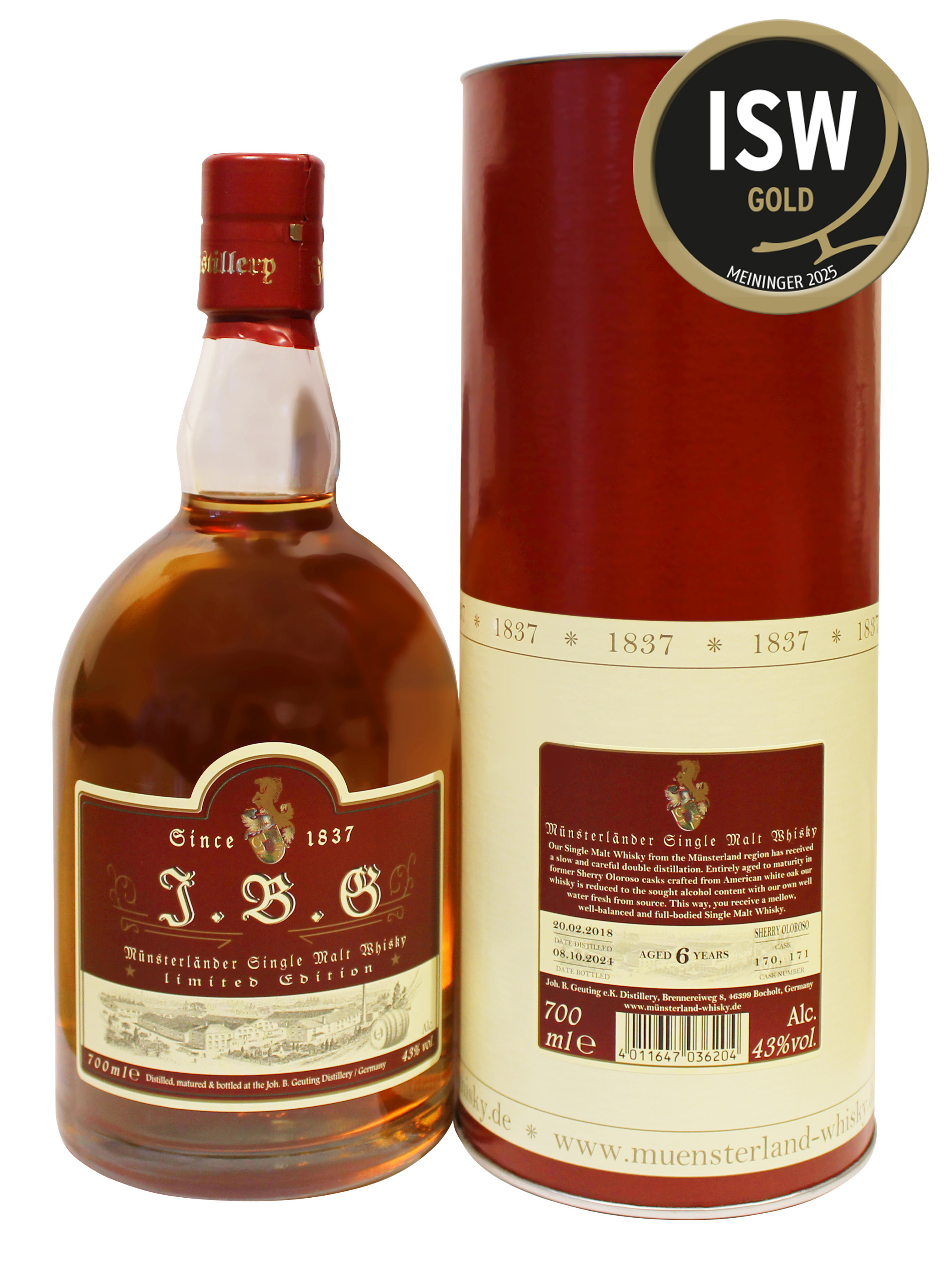 J.B.G Münsterländer Single Malt Whisky, 43%vol., 6 Jahre alt, Sherry Oloroso cask.